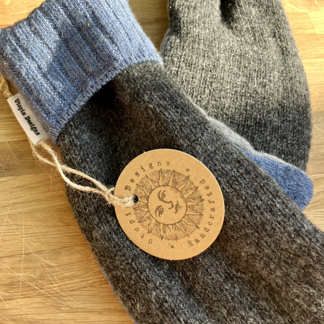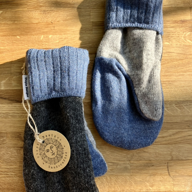 The pre-loved jumpers were felted before being cut up and sewn, resulting in a beautiful pair of cosy mittens. Each pair of mittens is different and unique!