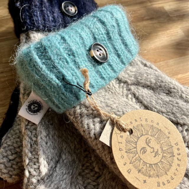 Handmade mittens made from upcycled jumpers, finished with a natural cork tag.