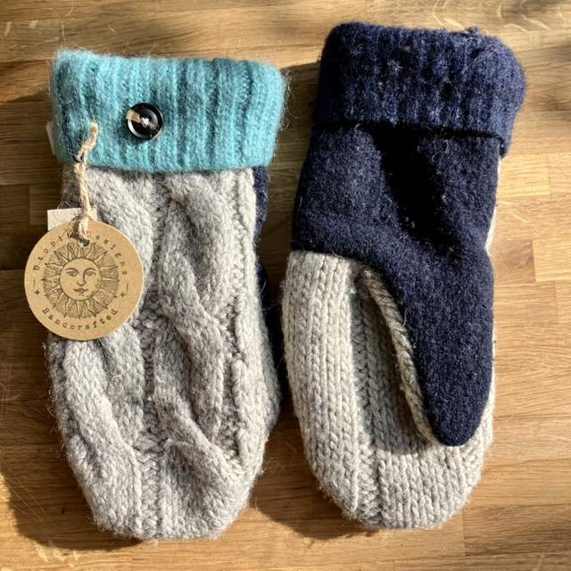 The pre-loved jumpers were felted before being cut up and sewn, resulting in a beautiful pair of cosy mittens. Each pair of mittens is different and unique!