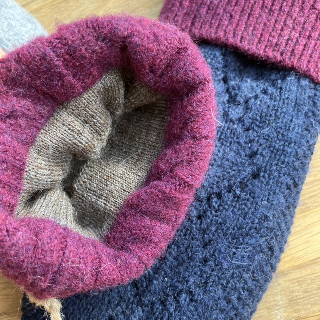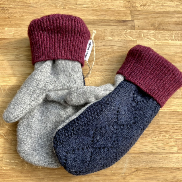 The pre-loved jumpers were felted before being cut up and sewn, resulting in a beautiful pair of cosy mittens. Each pair of mittens is different and unique!