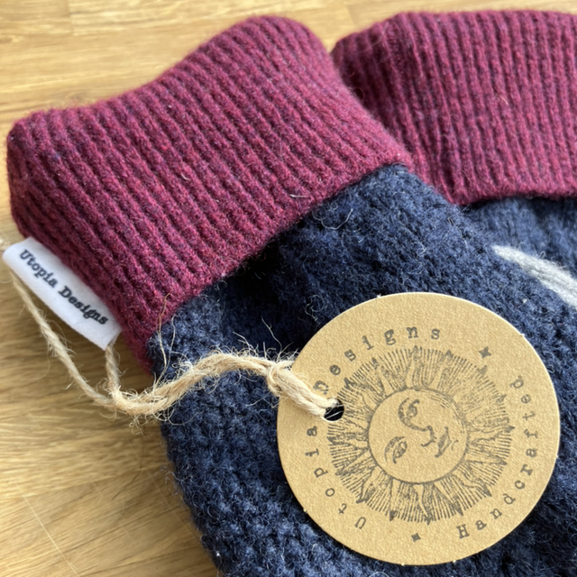 Handmade mittens made from upcycled jumpers, finished with a natural cork tag.