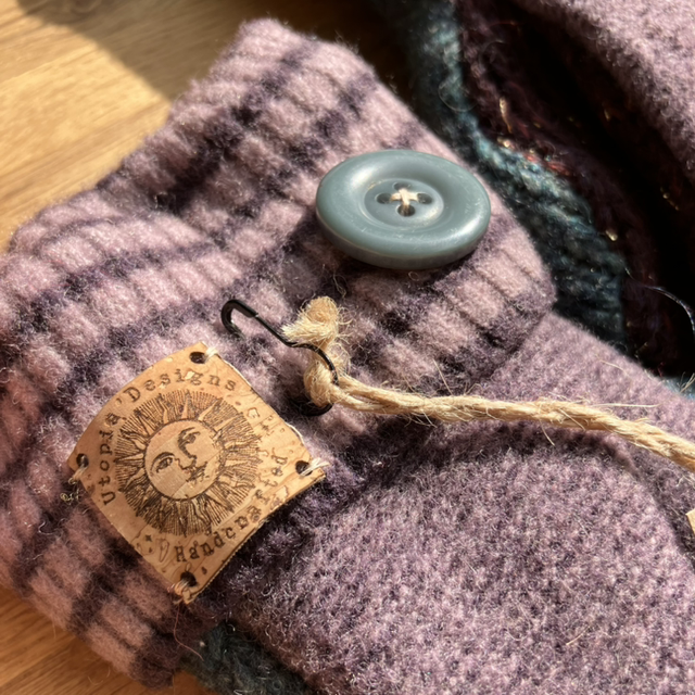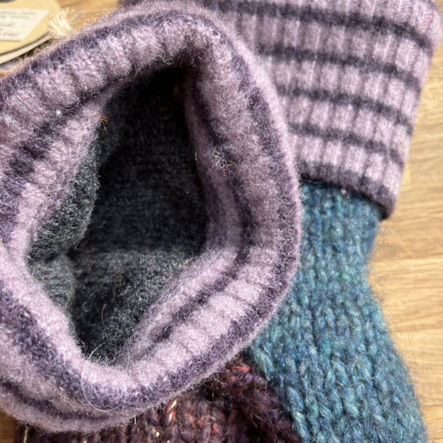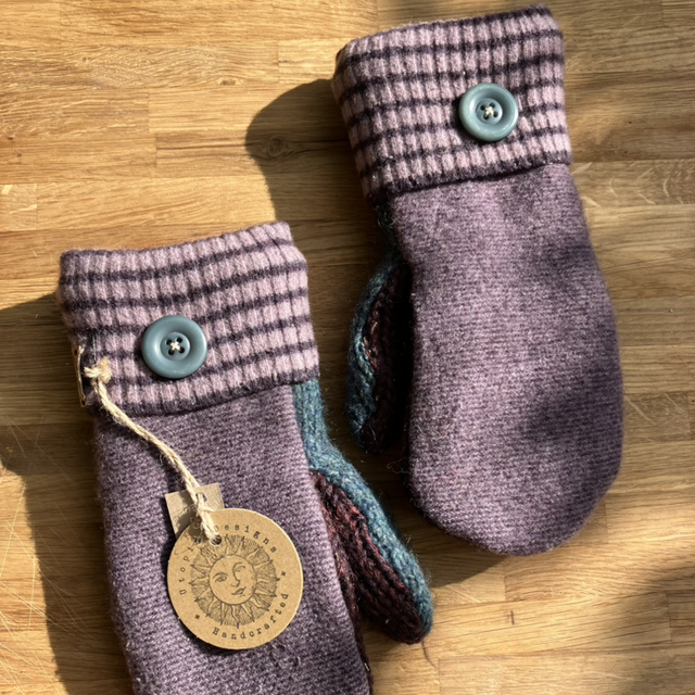 The pre-loved jumpers were felted before being cut up and sewn, resulting in a beautiful pair of cosy mittens. Each pair of mittens is different and unique!